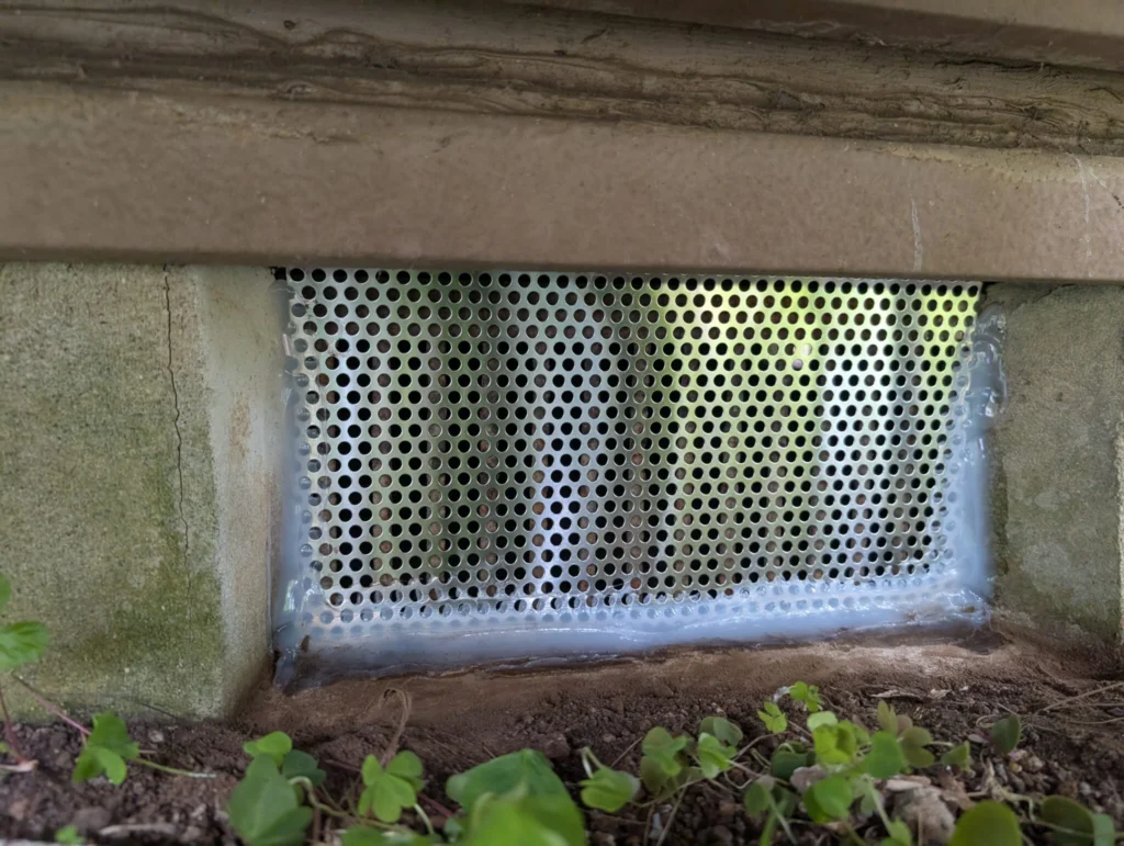 床下通気口をパンチングメタルとコーキングで封鎖