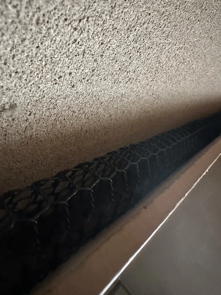 今回の事例では、長押の内部にネズミが出入りした形跡が確認されました。そこで、長押内部の開口部に柔軟性と耐久性のある樹脂ネットを設置し、ネズミが通り抜けられないよう隙間なく封鎖する対策を行っています。