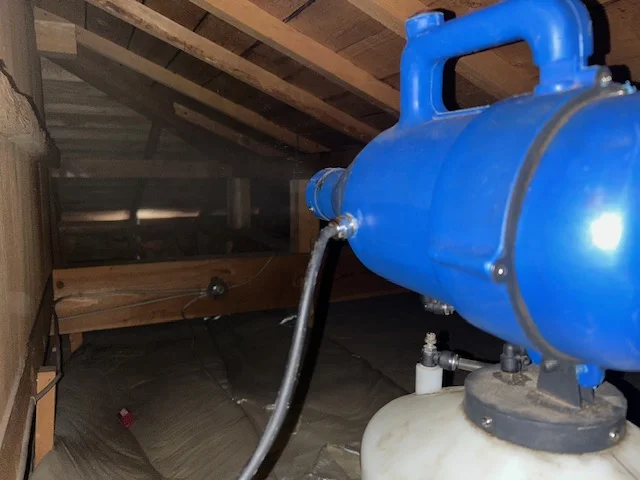 画像の青色の機材は噴霧器で、専用の薬剤を空間全体にまんべんなく行き渡らせるためのものです。缶の方は、市販では手に入らない業務用の特殊な薬剤で、高い忌避効果を持ち、ネズミを追い出しやすくなります。